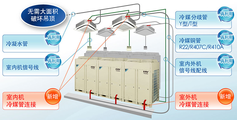 大金針對空調(diào)改造難題,憑借強(qiáng)大的研發(fā)能力,針對空調(diào)改造市場首推大金VRV更新用Q系列,讓大面積拆除吊頂與冷媒配管不再成為空調(diào)改造的必備流程,只需更換老舊空調(diào)系統(tǒng)的室內(nèi)機(jī)和室外機(jī),即可輕松快速實現(xiàn)空調(diào)系統(tǒng)的改造。